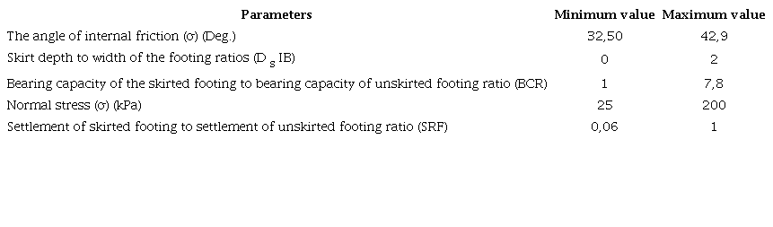 Furthermore, an additional 94 and 266 data points were collected from the author's experimental work reported elsewhere (Gnananandarao, Khatri, and Dutta, 2018). Hence the total data points used for modeling were 137 and 397 for the BCR and the SRF, respectively. The data for the other regular shaped footings (rectangular and strip) were excluded due to scarcity in the literature. The range of the various input parameters for which the developed model is applicable is also presented in Table 4.