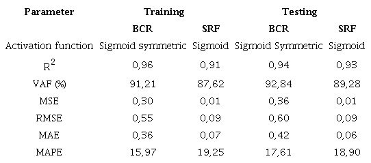 The predictive models with an R2 of 1, VAF of 100%, and MSE, RMSE, and MAE of zero indicate a perfect model (Hajihassani, Abdullah, Asteris, and Armaghani, 2019; Huang, Asteris, Koopialipoor, Armaghani, and Tahir, 2019; Xu, Zhou, Asteris, Armaghani, and Tahir, 2019). The mathematical formulas for these performance measures (reported by Dutta et al. 2015b; Dutta et al. 2018; Gnananandarao et al. 2019) are provided in Table 5 for the BCR. In the same table, the performance measures for the SRF can be written just by replacing the BCR with the SRF. Based on the best statistical results, sigmoid symmetric and sigmoid were selected as the activation functions for the BCR and the SRF, respectively. The performance measures for these functions in the training and testing phase are shown in Table 6.