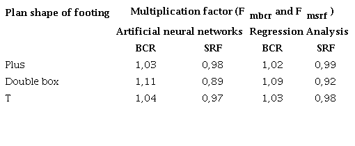 where Fmbcr can be calculated by a procedure similar to the one described in the previous sections. The SRF equation for the regular shaped footing was obtained after the regression analysis as: