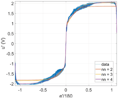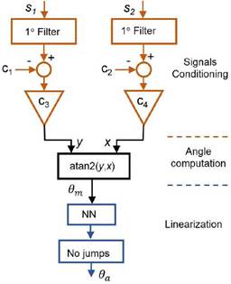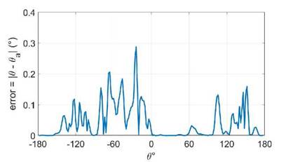 Any mechanical misalignment in the measurement configuration or between the sensor gains causes a discrepancy between the actual angle, θ, and the output of the function atan2, also called θm . This difference was as high as 10%, so the author used a neural network (NN) to reduce that error. The basic idea to reduce the error is to train a NN to learn the inverse relationship between θ and θm. Thus, when a mechanical position 9 produces an estimation equal to θm, that estimation ideally produces an output equal to θ in the NN. The author used a feed-forward backpropagation network with 8 neurons in the input layer and 4 neurons in the hidden layer. The input data θ cover angles between -180° and 180°, with data points every 1°. Figure 2 shows the error in the estimation using the NN to linearize the angle measurement. The error always remains under 0,3°.