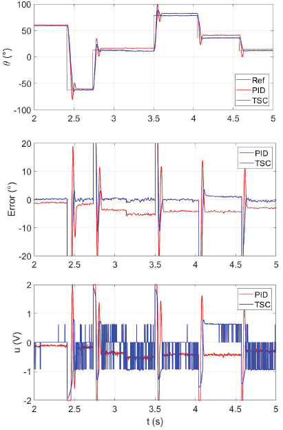 The oscillation of the control signal u (t) in the lower part of Figure 10 shows another feature of the proposed controller that was not programmed intentionally but emerged from the definition of the system itself. If the absolute value of the error is smaller than 10°, the actuating signal u (t) switches between two values, which resembles the work of a PWM when switched to increase the efficiency of a system. TSC applies energy to the system only when it is necessary and the error is larger than 1° in this application. By doing so, the controller avoids system oscillation. However, if the absolute value grows larger than 10°, the actuating signal has a traditional continuous shape. These two control actions will be the focus of future studies on the application of TSC.
