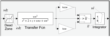 In summary, the model in Figure 3 has dead zone sdz = -0,9, edz = 0,6; transient wn= 300, ζ = 1; gains kcw= 940, kccw= 530; and saturation: ul = 110°, II = -110°.