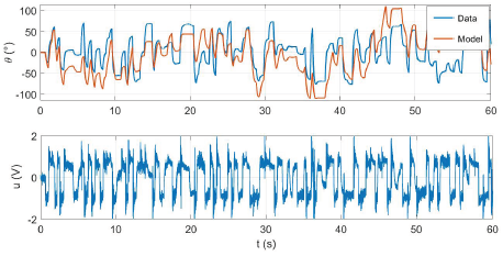 The four remaining parameters of the model were computed using the tool Parameter Estimation of Simulink. Given that the main goal of the model is to emulate the system when the controller is working, then a proportional controller with kp = 1/10 leads the motor during the acquisition of the input and output data. The whole experiment lasts a minute and uses samples every millisecond, so there are 60001 data points for the input and the same number for the output. The reference for the control system is a step function randomly changing from 0,3 to 0,7 s with also random amplitude from -100° to 100°. This signal was smoothed using a first order filter with constant time of 0,1 s, which better emulates the work of the motor during normal conditions. The optimization method is the Nonlinear Least Squares and the algorithm is Levenberg-Marquardt. The tolerance in the optimization is 0,001. Afinal estimation was run, including all the parameters except the saturation constants. The natural frequency changes to wn= 300 rad/s. It is important to report that the change from 100 to 300 in wn didn't alter the quality of the approximation in more than 0,1%, which means that the nonlinearities affect the dynamic of the motor more than the linear part. The results of the optimization are shown in Figure 4, where the lower part corresponds to the input voltage, while the upper part is the output of the plant and the model.