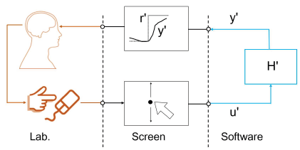 Figure 6 also shows that the information presented to the human controller through the scope is not the scaled error, e' (as it is done in traditional control), but its negative, -e'. It can be seen that, regardless of the value of the output y', the output will eventually match the sign of the input u'. For instance, if u' increases, then y' (as well as -e' = y' - r') will eventually also increase. Thus, if -e' is, for instance, negative, a good control action will consist of setting u' as a positive value. This action is intuitive for a human: it is performed to counteract the signal in the screen in order to have null error. On the other hand, the block "Mouse Pointer Reading" in Figure 6 runs a function based on the function "gpos" of Matlab, which provides the coordinates of the pointer of the mouse. The y value of the pointer corresponds to the value of u'' .