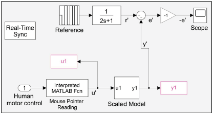 Blocks u1 and y1 in Figure 6 save the data generated during the running of the simulation and make it available for use in the workspace of Matlab. The signal u' corresponds to the actions of the human controller, while y' provides the corresponding emulated position given by the scaled model. Finally, the block "Real-Time Sync" allows the running of the simulation in real time using the Simulink Desktop Real-Time toolbox.