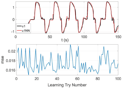 Figure 8 shows the results when training 100 neural networks with four neurons in the hidden layer. The lower part of the figure shows the final mean square error mse for each training. This error was used as the measure of quality during the learning process. It can be seen that the variation of mse is not big: the best mse is 0,015, while the worst is 0,022. The upper part of Figure 8 presents the results for the NN with the best performance out of the 100 trials. This part of the figure shows the output data u1 and the output of the network (u1NN) when fed with the same input. The network closely follows human control behavior, especially in Zones 2 and 3.