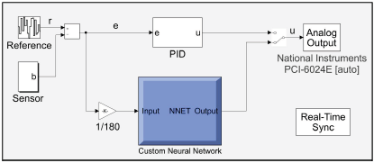 The final and definite test uses the trained NN to control the real plant. The block diagram of the connections inside the computer is shown in Figure 9. It can be seen that the input of the network is scaled dividing the error by 180. The output of the controller reaches the plant using a data acquisition card, the National Instruments PCI-6024E. This card translates the actuating signal inside the computer into voltage to feed the power amplifier that drives the motor. Figure 9 also shows a traditional PID controller with the same tuning that was used during the Scaling stage, it is a proportional controller with kp= 1/10.