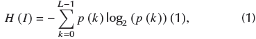 where I is the input image (or audio), p(k) is the probability of occurrence of the value k in the image (or audio), and L is the total number of levels of the image (or audio), with L = 2q for q bits of quantization. For example, in grayscale images, L = 28. If all intensity values have equal occurrence, then entropy is equal to q (8 in the example). However, if occurrence is not homogenous, the entropy value will be lower because uncertainty decreases.