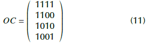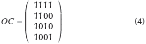 In a similar way to the previously outlined example regarding the image coding module, suppose the system works with 2-OVSF codes and the orthogonal codes are '1111', '1100', ' 1010', and ' 1001'. The value of the OC matrix is: