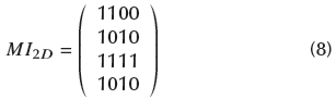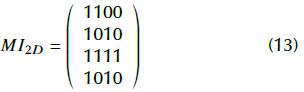 The first MI2D code, ' 1100', is compared against each SOC code as the algorithm searches for a match. It is found that if row zero of MI2D is equal to the first row of SOC, then the returned value is 1. If the first row of MI2D , '1010', is matched with the third row of SOC, then the returned value is 3. Next, the second row of MI2D , ' 1111', is matched with the 2nd row of SOC, and the returned value is 2. Finally, the 3rd row of MI2D , "1001", is matched with row zero of OC, and the returned value is 0. At the end, the returned value is I1d = [1320]. With m = 2 and n = 2, the recovered image is: