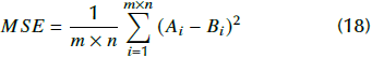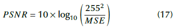 where MSE is the Mean Squared Error, A and B are the images, and the index i represents the absolute position of the pixel (e.g., left to right and up to down). If A and B are equal, then MSE is 0 and PSNR is ∞. Higher values of PSNR are preferable.