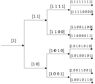 OVSF codes are originally used for channelization in Wideband Code Division Multiple Access (WCDMA). These codes are characterized by being orthogonal to one another, as well as their length being determined in terms of the level (L). An L-OVSF has 2L codes of 2L bits each. A way to obtain OVSF codes is through the application of an iterative tree that uses the value of the predecessor code as the root of the current code (Saini and Bhooshan, 2006). Each root has two descendants that double its length. The first descendant repeats the predecessor code, and the second one complements it. Figure 1 shows the 3-OVSF code tree.