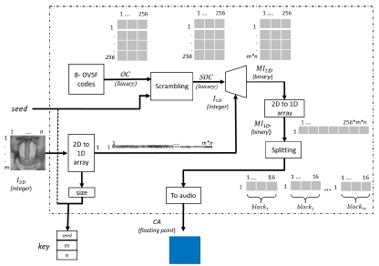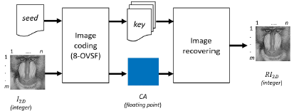 Figure 2 shows the proposed general diagram. The inputs of the image coding are the image (I2D ) and the seed, the outputs are the ciphered audio (CA) and the key. In the image recovering module, the inputs are CA and the key, the output is the recovered image (RI2D ).