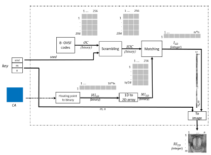 Scrambling the 8-OVSF codes: The aim of this block is to disorder the matrix obtained in the previous block. Using a seed value, the order of the rows in the OC matrix is reorganized. The output is named "SOC" (Scrambled OVSF Codes) with dimensions being 256 x 256. This block provides security to the scheme (analyzed in detail in Section of Security analysis).