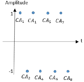 In addition, suppose the binary sequence value obtained from theCA is MI1D = [1100101011111001]. Since the system works with 2-OVSF, the length of every orthogonal code is 4 bits, and MOI1D is split into 4-bit sub-blocks. The result is the following MI2D value: