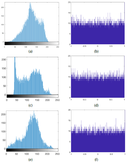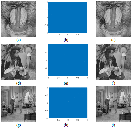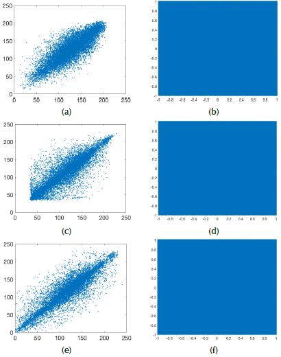 The performance of the proposed method is illustrated for three images. Figure 7 shows the original image, the CA, and the recovered image; Figure 8 shows the data distribution (image and CA); and Figure 9 shows the data correlation. According to the results shown in Figure 7, each recovered image is highly similar to the input image. In all three cases, the SSIM is higher than 0,999 and PSNR is ∞. Additionally, the ciphered signals look like noise, with a maximum value of 1 and minimum value of -1. Histograms of the CA signals (Figure 8(b), 8(d), 8(f)) are quasi-uniform, even though the histograms of the images are not uniform (Figure 8(a), 8(c), 8(e)). The entropy of the images is around 6 for 8 bits of quantization (75%), while the entropy of the CA files is 15,75 for 16 bits of quantization (98,5%). These results suggest that the system performed as expected. Finally, Figure 9 shows the behavior of adjacent (horizontal) pixels and neighboring samples. It is clear that the original image is highly correlated because the behavior of the adjacent pixels is around the main diagonal. However, in the case of neighboring samples (audio signal), the data is uncorrelated because the results are scattered in all directions.