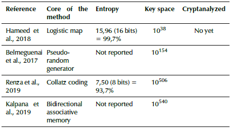 To enhance the diffusion property, chaotic sequences are mixed with DNA-based techniques, which consist of changing the value of the shuffled pixel by an encoding process into nucleotides (Zhang, Fang, and Ren, 2014; Chai, Gan, Yuan, Chen, and Liu, 2019). Nevertheless, DNA encoding has also been cryptanalyzed (Wen, Yu, and Li, 2019; Akhavan, Samsudin, and Akhshani, 2019). Another solution consists of elliptic curves for obtaining pseudo-random sequences (Hayat, and Azam, 2019). This method was also cryptanalyzed (Khoirom, Laiphrakpam, and Themrichon, 2018). Unlike the afore-mentioned methods, in literature, there are proposals that differ from the traditional schemes which have yet to be broken. For instance, Kumar and Quan (2019) analyze images using polar decomposition and the Shearlet transform, whereas, in Ballesteros, Peña, and Renza, (2018) diffusion and confusion tasks are performed through an encoding process using scrambled Collatz conjecture-based codes. However, the entropy value of the ciphered data fails to reach the possible maximum.