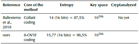 In terms of entropy, OVSF is expected to provide a high value of uncertainty for the encrypted image due to the quantity of zeros being similar to the quantity of ones. For example, for 3-OVSF, there are seven codes where the number of zeros is equal to the number of ones; only the first code has all bits equal to "1". In total, there are 28 zeros (0,44%) and 36 ones (56%). For 8-OVSF, the number of bits equal to 0 is 32640 (0,498%), while the number of bits equal to 1 is 32 896 (0,502%). For higher values of L, the quantity of zeros and ones is more symmetrical. Thus, the orthogonality property of OVSF codes is used in our proposal for obtaining high entropy values in encrypted images.