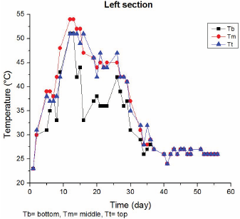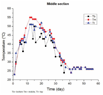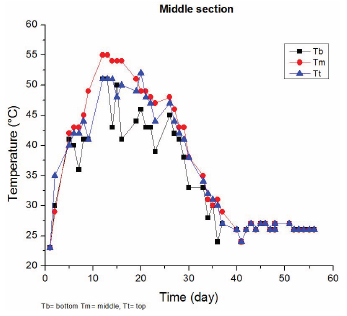The maximum temperature in the three sections of the pile was 55 °C on average, which was obtained on the 15th day of the process. In piles with a greater volume of material, the temperature could reach 70 °C during the degradation of animal manure (Tang, Yu, Liu, Xu, and Shen, 2011) and green waste (Cáceres, Coromina, Malmska, and Marfa, 2015). The end of the thermophilic phase and the beginning of the maturation phase were indicated by temperature decrease in the composting pile. As organic waste stabilizes, the temperature will continue to decrease to room temperature (Sánchez, Serramiá, Civantos, Fernández, and Roig, 2010), which also marks the depletion of the degradable organic fraction in the waste (Ravindran and Sekaran, 2010).