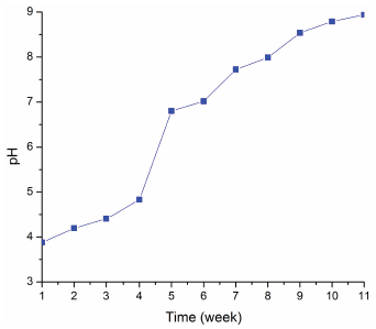 The composting process was performed under aerobic conditions (Figure 6). The initial pH of the employed substrate was 3,5 and, at the end of the process (11 weeks), it was 9,1. The aeration process contributed to raising the pH of the substrate, thus preventing the generation of organic acids due to the growth of anaerobic microorganisms, although ash and filter mud contributed to its alkalinization.