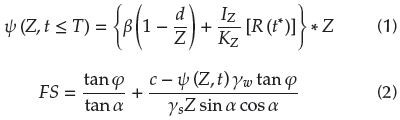 where d is the water table depth measured normal to the ground surface, Z is the soil depth, Iz is the rainfall intensity, Kz is the soil hydraulic conductivity, φ is the soil friction angle, α is the slope angle, c is soil cohesion, γw is the unit weight of groundwater, and γs is the soil unit weight.
