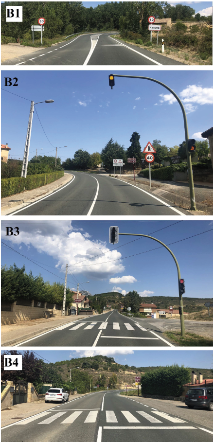 The LR-124 road crosses the village of Ábalos, in a segment of approximately 630 m, which divides the urban area in two parts, one of them being quite bigger than the other (Figure 1). However, the only ways to go from one part to the other are the existing two crosswalks. Pedestrians must cross this interurban road with a significant amount of traffic. With the aim of reducing the speed of vehicles when going through the village, traffic lights turning red if the speed limit is exceeded were installed in both directions as a TCM. Their location, as well as that of the crosswalks, is shown in Figure 1. In each direction, the sequence of the TCMs is as follows: