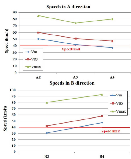 In the other direction, (Briñas - Logroño) values in point B3 were quite satisfactory, since both Vm and V85 were near 40 km/h. Only 18,1% of the drivers did not respect the signs and the red light. In this case, drivers speeded up from point B3 to B4, and the average speed was over the limit. V85 also had a value of 58 km/h. Hence, 78,8% of drivers exceeded the speed limit in their second crosswalk (Figure 4b).