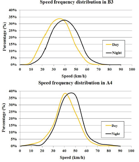 As seen, speeds at night were higher than during the day. Both values of Vm and V85 followed this trend. Moreover, the standard deviation at night was also higher. Generally speaking, during dark hours, average and V85 speeds tend to be lower, although the standard deviation is higher (Kraemer et al., 2005; Pérez-Acebo, 2018). However, research about speed in speed humps and in control sections with similar values between daylight and darkness can be found in the literature (Jägerbrand, Johansson, and Laike, 2018). However, in this road, drivers tended to go faster at night, as they assumed that very few pedestrians might be crossing the carriageway.