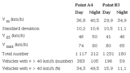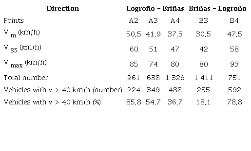 More than 4 300 vehicles were measured in this research. Table 2 presents the average speed of the vehicles, Vm ; the percentile 85th of the speed, V85, which is the speed not reached by 85% of vehicles or, in other words, the speed achieved or exceeded by 15% of the vehicles); the maximum speed, Vmax ; and the total number of vehicles controlled. Additionally, the number of vehicles that exceeded the speed limit (40 km/h) and the percentages of vehicles exceeding this limit are shown.