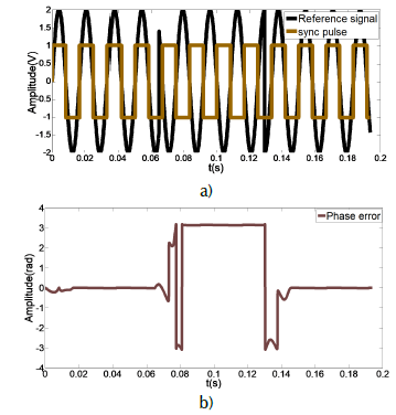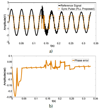 With the third test case, the effectiveness of this proposed PLL is verified. The input signal (continuous black line) refers to the behavior of the power line. This is shown in Figure 5 a), where the output signal or synchronization pulse (square signal) is also observed. Synchrony is lost only for an instant of time (close to 0,08 s) and then resynchronizes even when disturbances are evident. The maximum phase error is 0,061 (rad) and it takes 0,4025 s for the PLL to lock in, as shown in Figure 5 b).