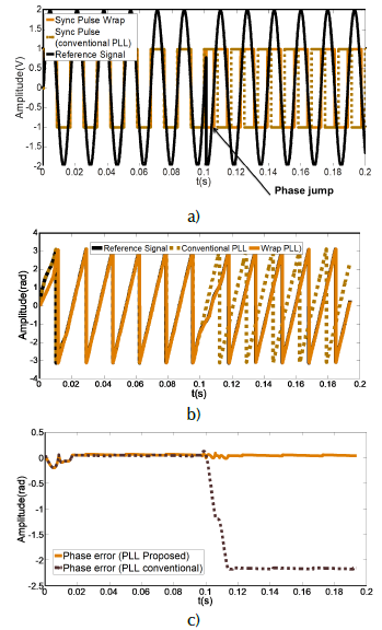 The first case is a sinusoidal type reference signal with a phase jump of 180° that is approximately 0,1 seconds, as shown in Figure 3 a). The same figure also shows the behaviors of the output signals of the proposed PLL (continuous orange line) and of the conventional PLL (dotted brown line). Before the disturbance, both square signals (sync pulses) are in tune. When the phase jump occurs, only the sync pulse produced by this proposed model remains in phase and frequency with the reference signal (black signal). To show the phase error, the FFT function is used. The phase values are observed in Figure 3 b), taking a period to obtain the data window for the FFT processing in all tests. For this reason, a phase error is shown at the beginning of the graphs. It is worth mentioning that the Gibbs effect was not considered in the results. As shown in Figure 3 c), by subtracting the values obtained through the FFT, we have the phase error of the proposed PLL, which is close to zero (continuous orange line), while the conventional PLL phase error (dotted brown line) increases after the disturbance.