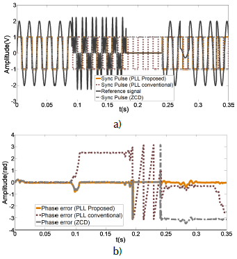 The experimental results of the synchronization pulses generated by the conventional PLL method and by the zero crossing detector are observed in Figure 6 a). The three methods are tuned with the sinusoidal signal without disturbances during the first seconds. When the harmonics begin, only two signals remain in tune: the synchronization pulse of the ZCD and that of the PLL with the wrap method. In the voltage drop, the ZCD sync pulse loses tune. The phase error results obtained from each of the synchrony methods are shown in Figure 6 b). The error is close to zero in the proposed Wrap PLL method.
