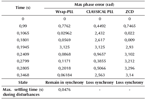 The summary of the results for the three analyzed synchrony methods is shown in Table 2. The proposed PLL significantly outperformed conventional PLL and ZCD most of the time. The PLL method proposed in this article remains synchronized despite the different disturbances, which is not the case with conventional PLL and ZCD.