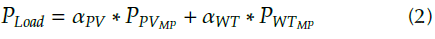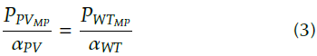 where (αPV) and (αWT) are defined as the curtailment indexes for PV and WT, respectively, which should be calculated in the EMS responsible for the management strategy. In order to have a contribution of each RES in proportion to its maximum available power (Presmp ), the following condition is established: