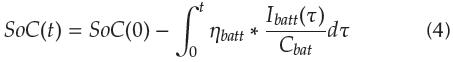 where SoC(0) is the initial SoC, Cbat is the capacity in (A • h), ηbatt is the charging/discharging efficiency, and Ibatt(τ) is the instantaneous current in the battery.