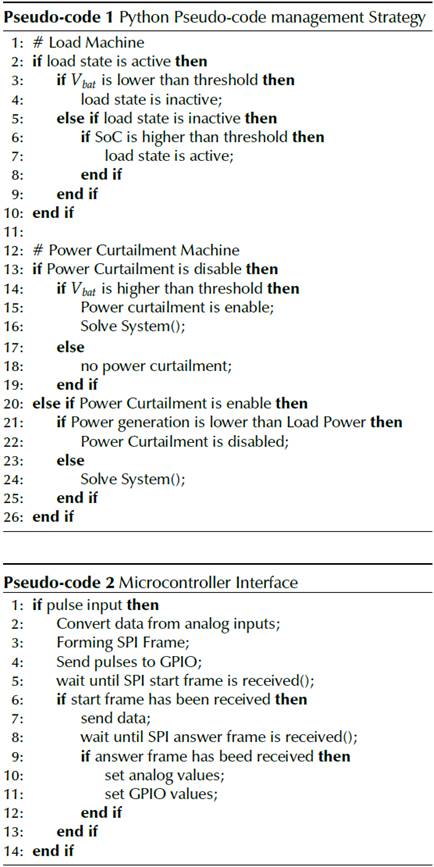 The state machine that executes the rule-based management strategy is implemented on the SBC with a Python3 script. The Numpy library is added to the script, which allows to operate vectors and matrices, and is suitable for solving the equation systems to obtain the curtailment indices of the generators. Within the state machine script, the communication functions with the microcontroller are added to get the analog values and send the curtailment indexes.