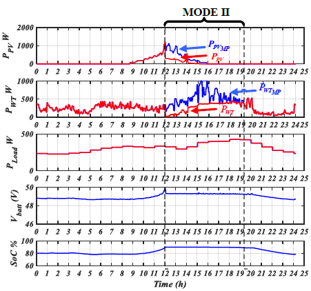 Figures 5 and 6 show the results obtained from the experimental platform with two different generation and load profiles. In Figures 5 and 6, it is possible to see that, when the battery reaches its maximum voltage value (V¡,att= Vmax), the operation of the microgrid changes to MODE II. As a consequence, the power generation from RESs (PPV) and (PWT ) is curtailed below their maximum available power (PPVmp ) and (PwTmp ) to keep the power balance in the system, and preventing the battery from overcharging. It can be seen that even in the accelerated simulation of the microgrid, explained in a previous section, the EMS devices manage to deal with all the required processes in the ruled-based management system.