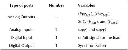 The Simulink-based microgrid model has been embedded in the OPAL® OP4510 real-time simulation platform. Therefore, by taking advantage of the analog and digital input and output ports of the OP4510, it is possible to have a real interaction with external devices. The embedded microgrid model provides measured variables such as the instantaneous power output of the PV and WT generators (Ppvmp and PwTmp ), the state of charge of the battery (SoC), the battery voltage (Vbatt), and the power consumed by the load (PLoad) through analog outputs. Also, external control instruction can be received by the microgrid, such as the curtailment indexes of the two generators(αPV and αWT ) through analog inputs, and the on/off control signal for the load through a digital input, as well as generating a synchronization signal to enable the communication with external devices through a digital output. Table 1 summarizes the input and output ports used for the interaction with the microgrid.