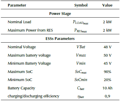 Figure 1 shows the basic structure of the islanded microgrid considered for this application. The microgrid has a DC configuration in order to avoid dealing with problems of reactive power and frequency regulation within the model. The microgrid consists of a hybrid PV-WT generation unit, an ESSs based on batteries, and AC loads integrated through a DC/AC conversion stage. Commonly, ESSs are responsible for ensuring the power balance and the regulation of the common bus in the local power grid. Meanwhile, RESs are more likely to operate as power sources at their maximum power point in order to harvest the maximum amount of available energy. Since ESSs have limited storage capacity, overcharge and over-discharge should be avoided to prevent degradation of the storage units. Since, for islanded applications, Lead-acid and Li-ion batteries are the most used technologies, it is important to consider that they are voltage-limiting devices. Because of that, their operation limits are defined by voltage levels, whose maximum value (Vmax ) roughly corresponds to a 90% of the state of charge (SoC), while the minimum (Vmin) roughly corresponds to a 20% of the SoC (Marra and Yang, 2015).