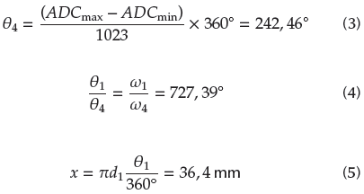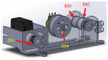 The DC motor pulley is represented by ω1 as the initial reference point of the round, which acts as an actuator, while the pulley on the coupled shaft is represented by ω2 and ω3. The potentiometer pulley is represented by ω4. The calculation of the reduction system has the purpose of determining how much reduction occurs in the motor-tendon actuator. This reduction pulley calculation starts from the pulley of a DC motor. Pulleys 1 and 2 are connected to the belt so that their linear velocity is the same. Thus, the equation can be written as follows: