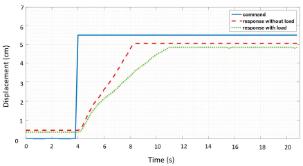 Figure 10 reveals the command signal represented by a blue line. The red-dashed lines represent the without-load response signal, while the green dot line represents the response signal with a load. The performance of the transient response system based on the test is shown in Table 5. "Without-load" means that the soft exoskeleton glove was unattached on the human hand, whereas "with a load" means that the soft glove was attached to the human hand.