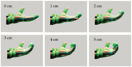 In this section, the results of the test with and without load will be discussed. The no-load test was carried out by pulling the sheath tendon every 1 cm to observe the curvature that was formed in the soft exoskeleton glove. Figure 12 shows the test results of the movement by pulling the sheath tendon. Based on the test results, there is a change in the angle of 67° on the first segment of the finger by pulling the sheath tendon from 0 to 5 cm.