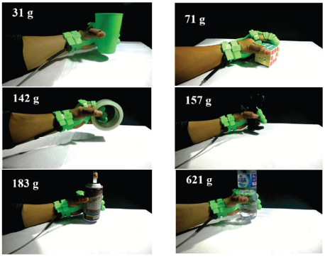 In the next test, the soft exoskeleton glove is used to assist and provide mechanical support to the user's hand. In this test, the glove is attached to healthy human hands. The test results are shown in Figure 13. Based on these results, the soft exoskeleton glove can assist and provide mechanical support in grasping six various objects of different sizes, shapes, and masses.