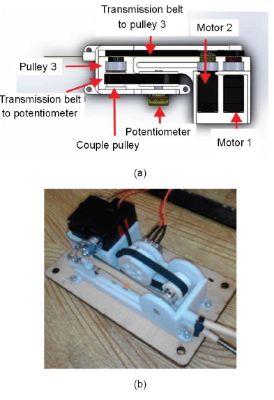 Figure 2 shows the design configuration of the motor-tendon actuator. It is worth noting that the purpose of kinematic modeling is to provide feedback control to the used actuator - in this case, a DC motor. Feedback is a signal from the potentiometer sensor in the actuator system. The potentiometer used in this study has a range of motion of 270°, while the DC motor rotation pulls the tendon-sheath from the normal position to the full grip position that requires more than one rotation. Therefore, a rotary reduction between the potentiometer and the DC motor is needed, so that the actuator rotation does not exceed the range of motion of the potentiometer. Figure 3 shows a reduction system using four pulleys.