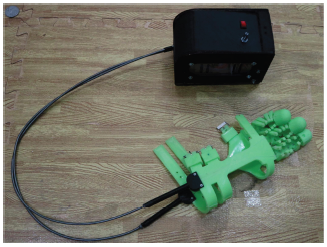 The development of the exoskeleton glove was conducted in our previous study (Setiawan, et al., 2020). Some of the soft exoskeleton glove and motor-tendon actuator manufacturing processes have been described in the research. After the manufacturing processes, the assembly process of all components, including the soft glove, the motor-tendon actuator, the motor-tendon actuator case, two Bowden cables, and electrical components were carried out. The wearable robot soft exoskeleton glove that has been completed through the assembly process is shown in Figure 4. The motor-tendon actuator can be worn on the waist of the user/wearer.