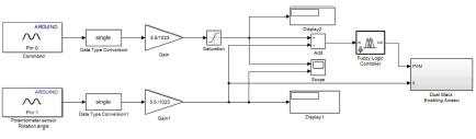 The rotational speed of the DC motor is controlled using PWM. When the value of PWM is positive, the motor pulls the tendon to move in flexion. However, while the value is negative, the motor stretches the tendon, or the soft glove position returns to its normal position. The output membership function response is identified in Table 2. After the membership functions of the input and the output are determined, the next step is to design a rule or logic. The employed logic is "if" and "then", which means that if the input X has been determined, then the output Y will be produced. The rule used in motor control in this study can be seen in Table 3. The embedded control block of the wearable soft robotic glove with FLC is shown in Figure 5. The FCL is developed with a Simulink block diagram, as shown in Figure 6. The reading of a potentiometer or electromyography (EMG) sensor is applied using analog input block with a sampling frequency of 50 Hz.