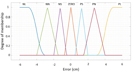 The selected method for controlling the employed DC motor is fuzzy logic control (FLC), whose implementation stages will be presented in this section. There are three main components in a FLC design: input, rule, and output. The output value used in the FLC is the pulse width modulation (PWM) value. The PWM value adjusts the movement of the motor clockwise or counterclockwise and increases or decreases the speed of the DC motor. The rule component is a fuzzy logic that is used for the produced output in accordance with the input. The three main components produce logic, which is then used for motor movement control in the actuator. The input used in fuzzy logic is an error value. Therefore, before designing the input part of the Fuzzy Logic Designer, it was necessary to determine the boundary of the error value that is used as the so-called the input membership function in this study. It is identified and summarized in Table 1.