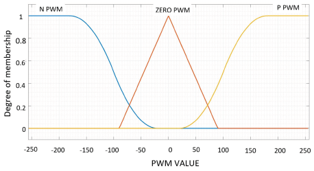 Membership Function Output is the PWM limit value entered in the output dialog box. The values entered are for a negative PWM from -180 to -20, as well as a positive PWM from 20 to 180. For typical values, as well as those in the plot, which are depicted with zero-lines, the entered value is -90 to 90. The best plot obtained by the membership function output as a response representing the value of the PWM output is shown in Figure 9.