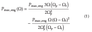 The engine is modeled by two empirical correlations. The cubic curve of the maximal power (Pmax,eng), Equation (1), is given by Ni and Henclewood (2008), and it is a function of engine speed (Ω). This model needs the following inputs: peak power, engine speed at peak power (Ωp) and engine speed at peak torque (Ωt).