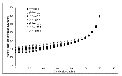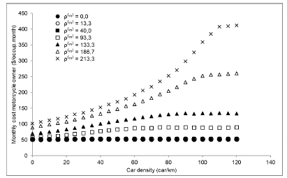 Figure 10 presents the individual costs for motorcycles. By comparing them with the monthly car cost (Figure 9), it is possible to notice that the costs for motorcycles are always lower, since they are cheaper and their fuel consumption is lower. Cars do not strongly influence motorcycle costs for low and medium motorcycle densities.